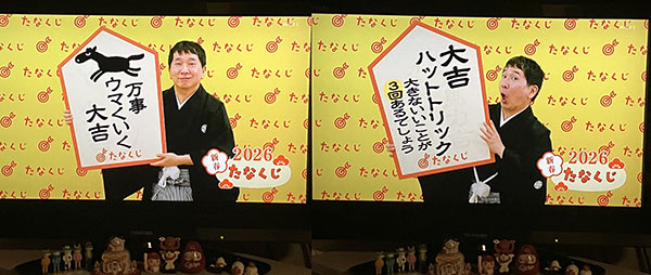ひとつめ。年またぎにいつも観ているEテレの番組で「たなくじ」というコーナーがあります。爆笑問題の田中さんがおみくじを持っていて、高速でランダムに表示されていきます。それをスマホで撮影して、写っていたものが今年の運勢結果になるというしくみ。